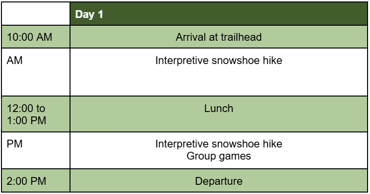Your program fee includes; snowshoes, all equipment for games and COA educational/interpretive sessions, COA guides with a maximum ratio of 1:14, up to date Insurance and Park Permits. Guides will carry a first aid kit, permits, 2-way radios, bear spray, InReach SOS device, maps of the area, and guide tarps at all times.