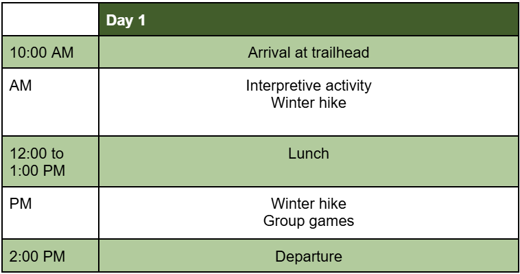 Students will be divided into small groups and provided micro-spikes (grippers for their boots) before they head out with their guide on an adventure suited to their ability level.