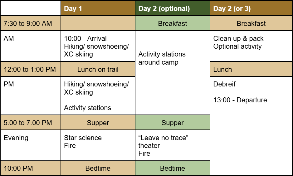 Your program fee includes all activity supplies, snowshoes, shovels, on site emergency vehicle, and potable water), recycling and garbage bins, all equipment for games and COA educational sessions, and COA guides with a maximum ratio of 1:14. Guides will carry a first aid kit, 2-way radios, bear spray, In Reach communication device, maps of the area, and guide tarps., A full kitchen will be available in the hostel for the group to prepare/store food.